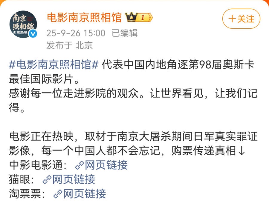 今悉,@电影南京照相馆 发布消息,《南京照相馆》将代表中国内地角逐第98届奥斯卡最佳国际影片。